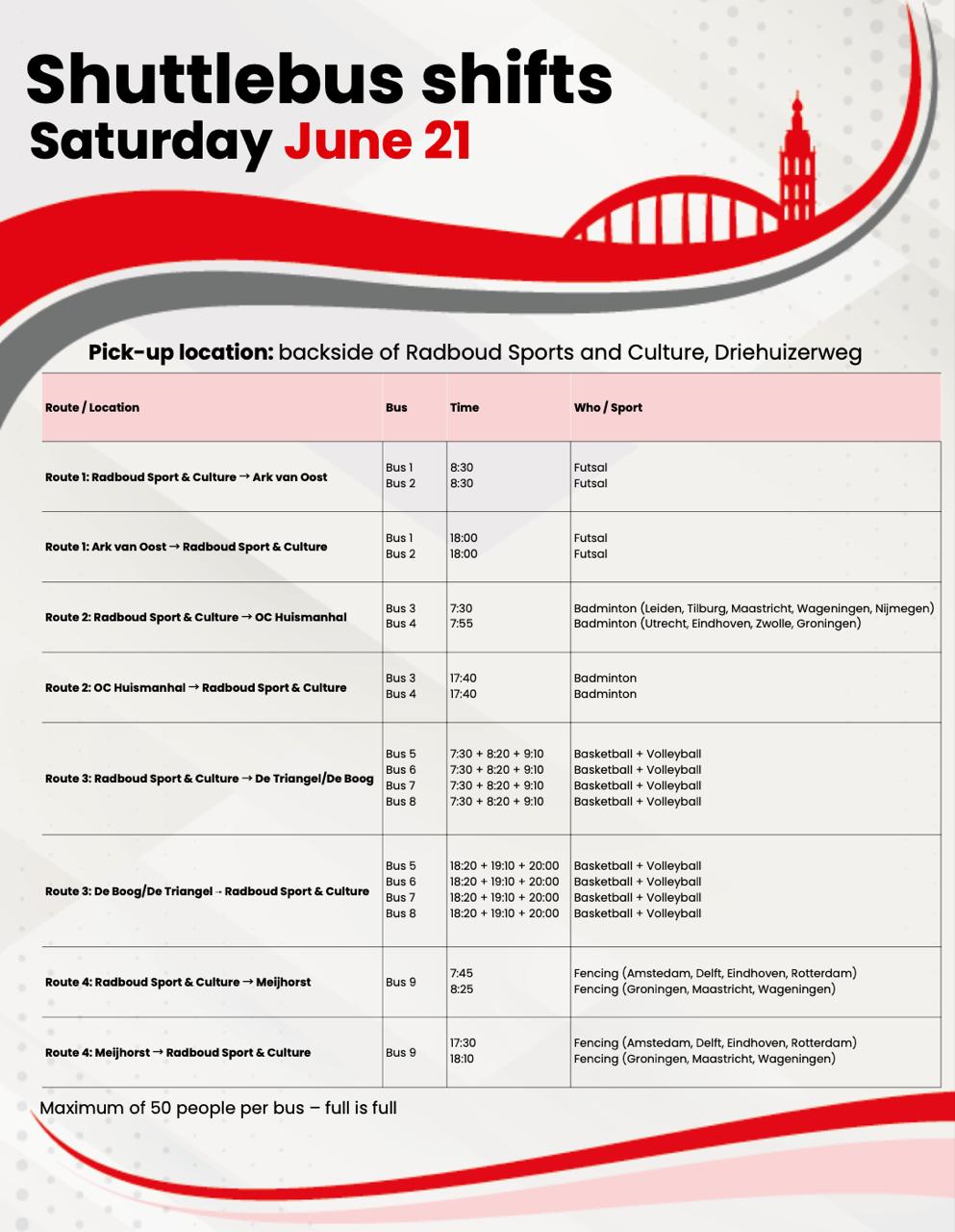 Pendelbus: De pendelbus rijdt ’s ochtends van 8:00 tot 8:40 uur naar de locatie en keert ’s middags tussen 17:00 en 17:40 uur terug naar het Radboud Sportcentrum.